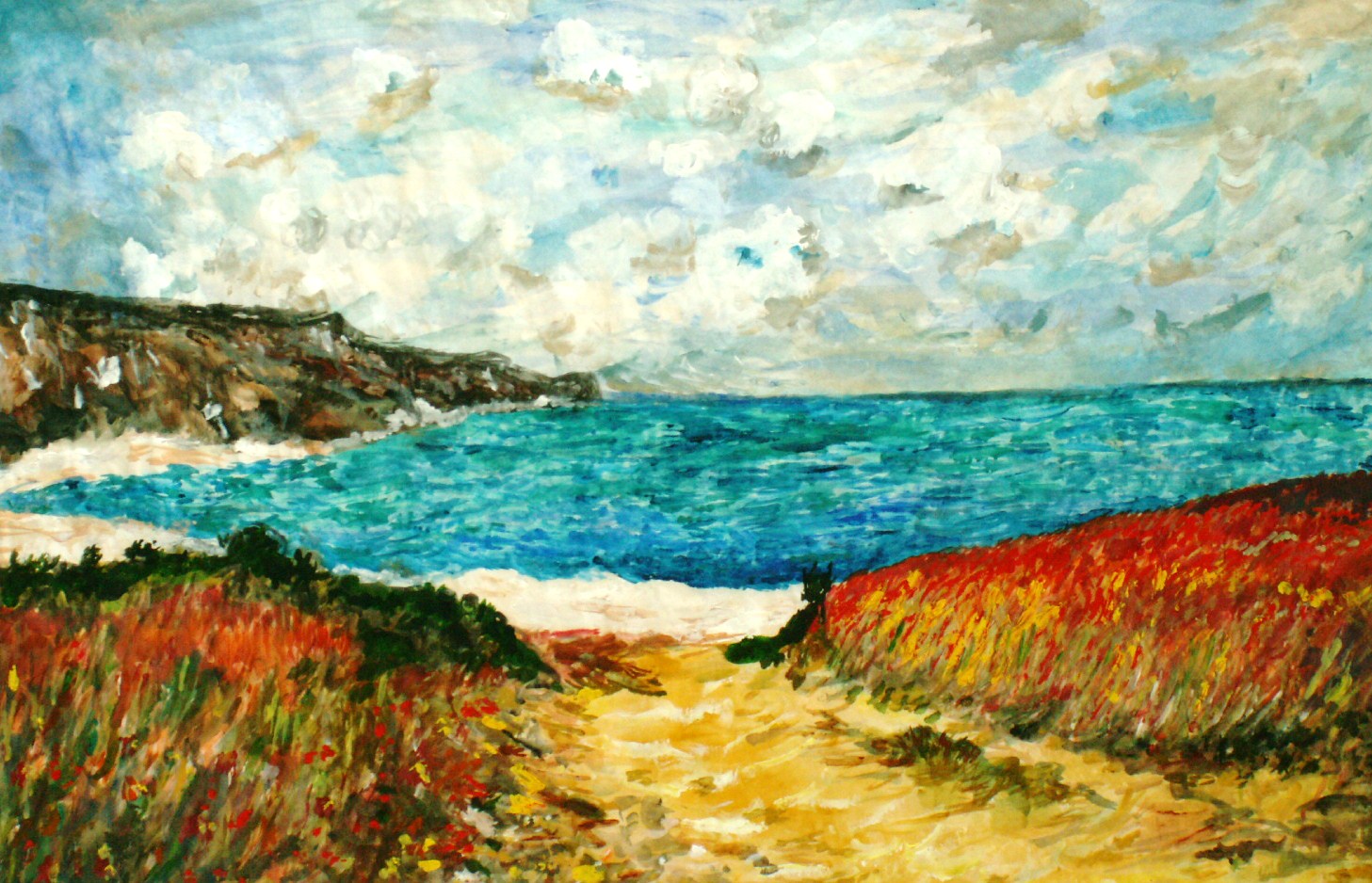 Hand painted copy of an original oil painting by Claude Monet, "Cap d'Antibes" Acrylic on paper 24 x 36 matted only $65 |