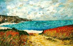 This is a hand painted copy of a Claude Monet impressionism. "Meadow Road to Pourville" (1802) Acrylic on Paper, 24 x 36 matted only $75 |