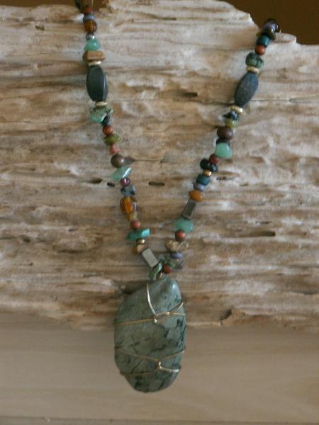 | #014 Also a collector of rocks I found this piece on the pacific west coast in Oregon on Gold Beach.I believe this is a type of jade that is native to the region. This piece contains a wide array of semi-precious stones of tiger- eye, hematite, jasper, adventurine, snowflake obsidian, turquoise, and mother of pearl and also contains wood and glass beads. A one of a kind natural beauty. Necklace length: 18" $45 |